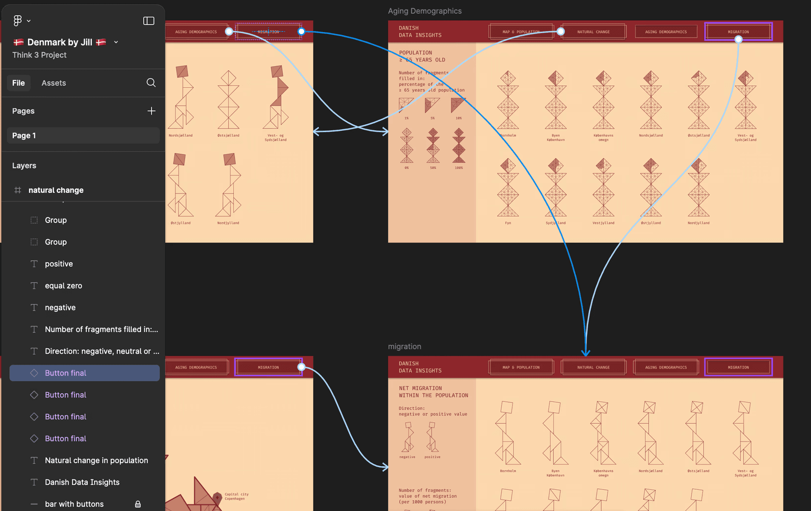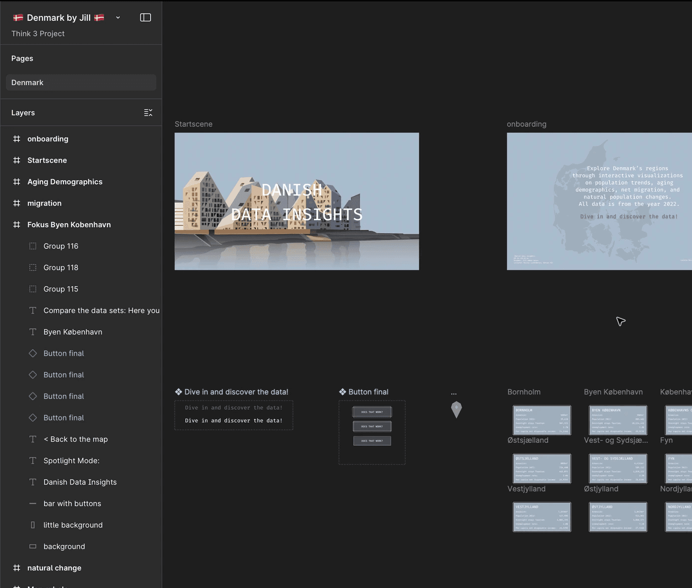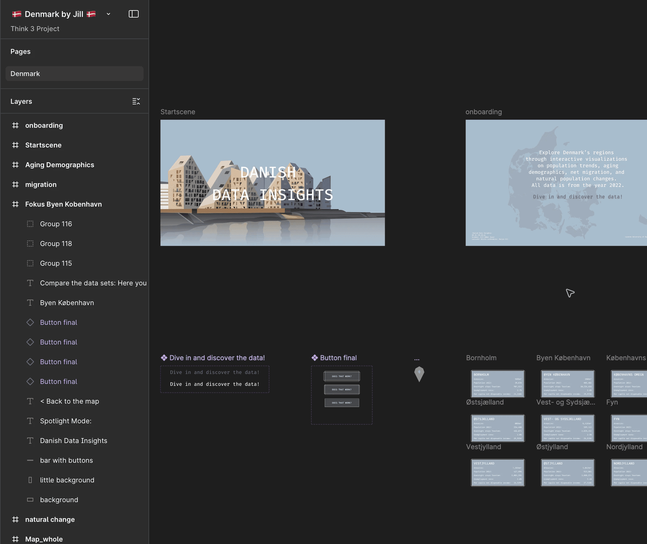 Mit diesem Projekt wagte ich mich zum ersten Mal ins Webformat und arbeitete dabei erstmals mit Figma. Im Zentrum steht Dänemark als Datensatz, den ich gesammelt, aufbereitet und in einen interaktiven Prototyp übersetzt habe. Der Prozess reichte von ersten Handskizzen über detailreiche Visualisierungen in Illustrator bis zur klickbaren Page in Figma.